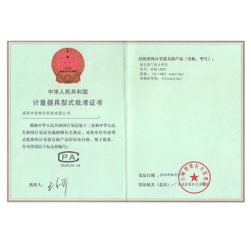 APEG-JH2S (0~100)%μmol-mol CPA計(jì)量器具形式批準(zhǔn)證書